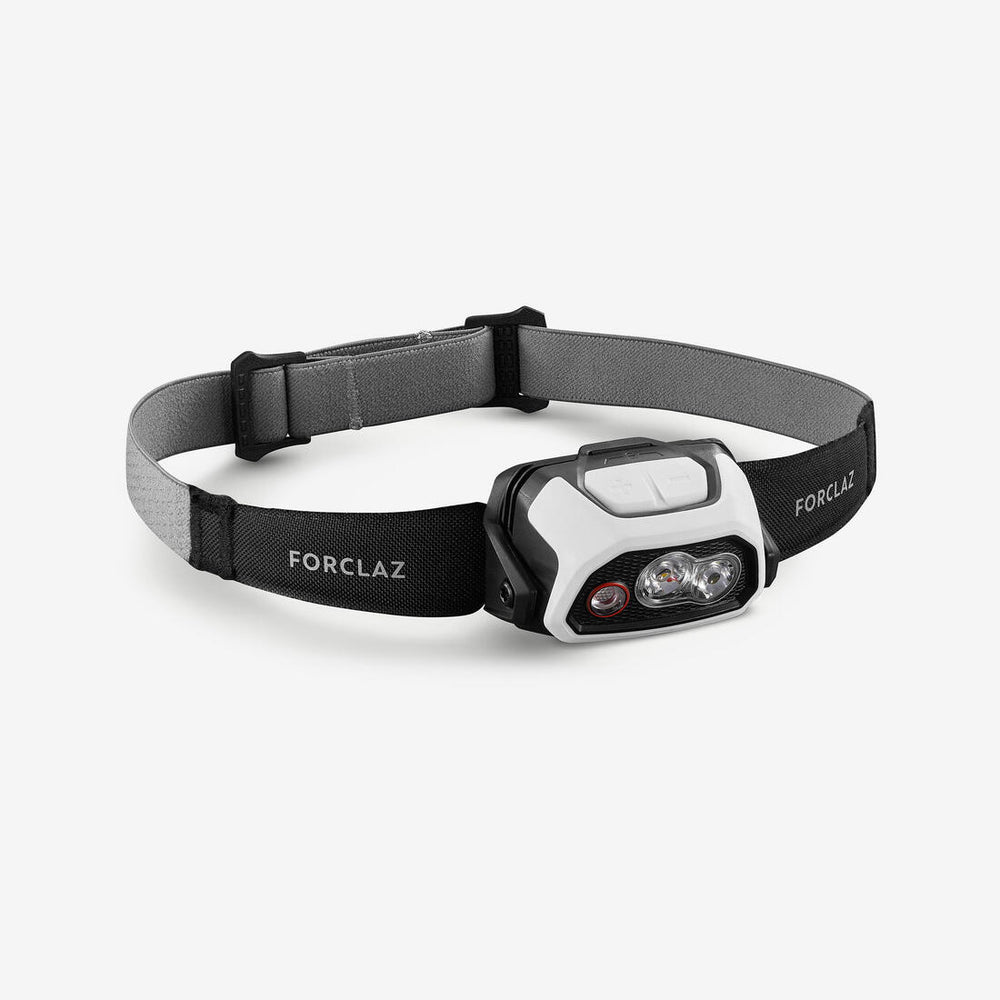 The FORCLAZ HL900 V3 headlamp offers 6 modes: - Static red to remain hidden in camp and maintain your night vision - Economy mode (30 lm) for map reading or use in the tent - Medium mode (80 lm) for working on tracks or forest trails - Full power mode (350 lm) for hiking on rugged trails - Boost (600 lm, 60 secs) for finding your way off track lasts 10 seconds before going back to 350 lm - Flash (Blinking) to signal your location and a 1 hour reserve at 25 lm