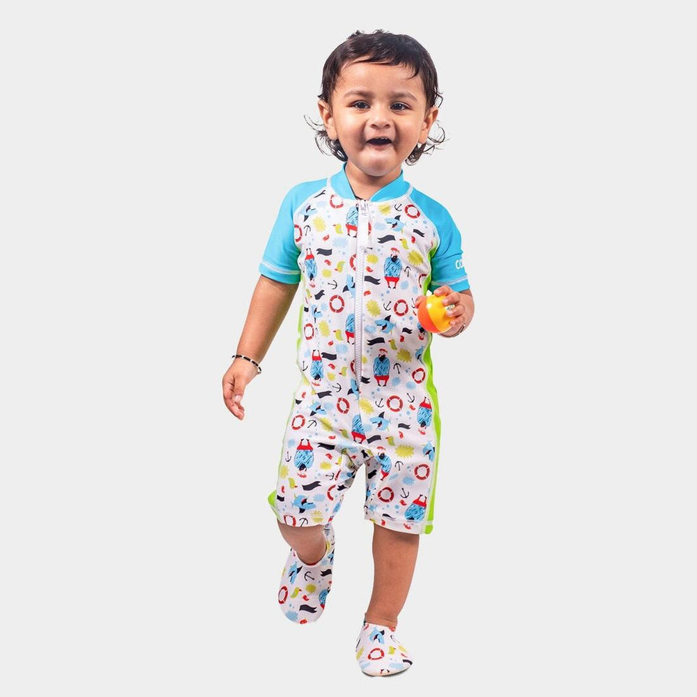 The popular COÉGA baby boys one piece suit is designed with a ¾ length front zip for quick and easy access for your active little one.
