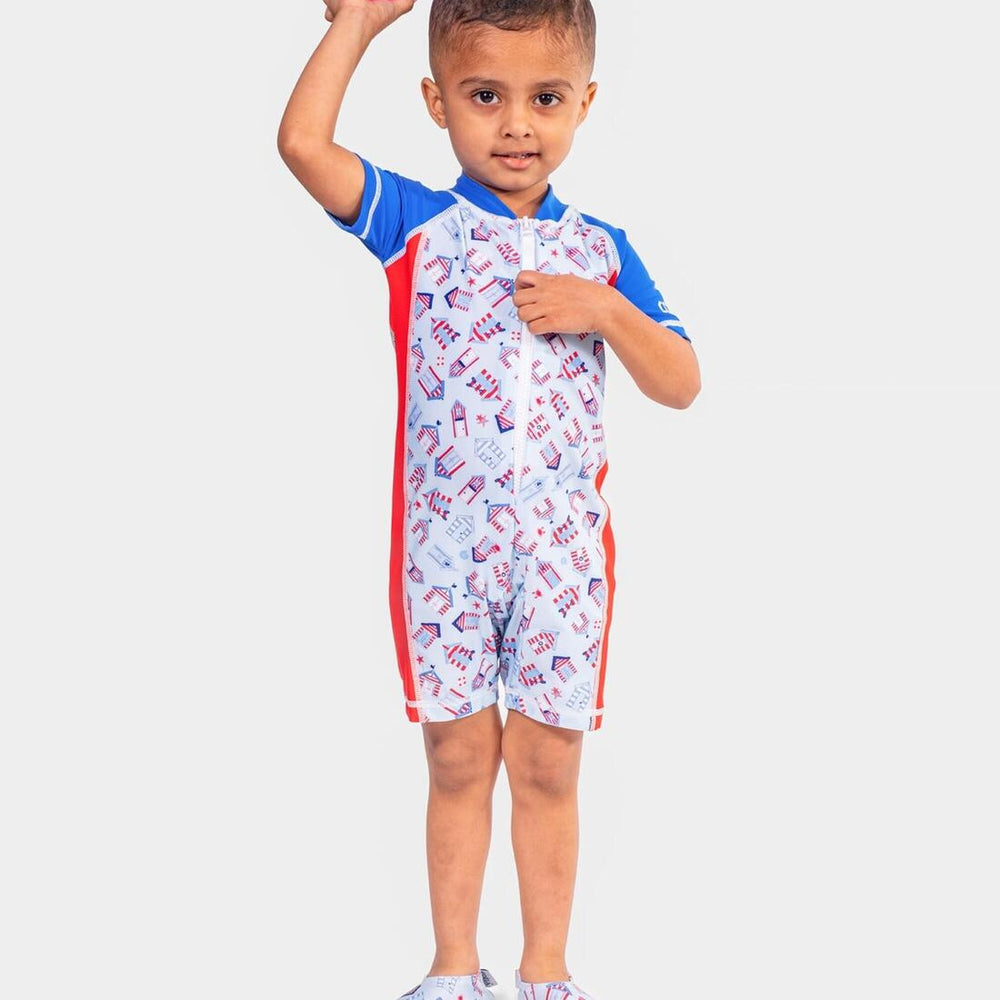 The popular COÉGA baby boys one piece suit is designed with a ¾ length front zip for quick and easy access for your active little one.