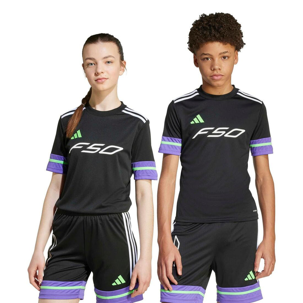 Fly across the field in a juniors' football jersey that salutes adidas speed boot royalty. This lightweight shirt will keep you fresh through every weaving run and lightning sprint thanks to its soft fabric and moisture-managing AEROREADY. A large "F50" graphic on the chest shows you were born to run.